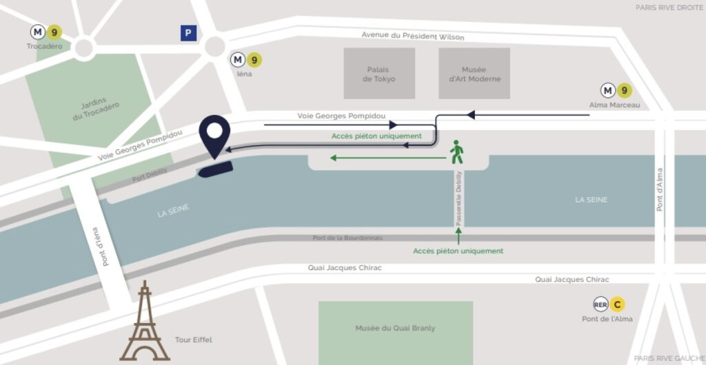 The boat will be located at Port de Debilly (75016 Paris - GPS coordinates : 48.8622863, 2.29408523251214), and will welcome you at 08:00 PM.