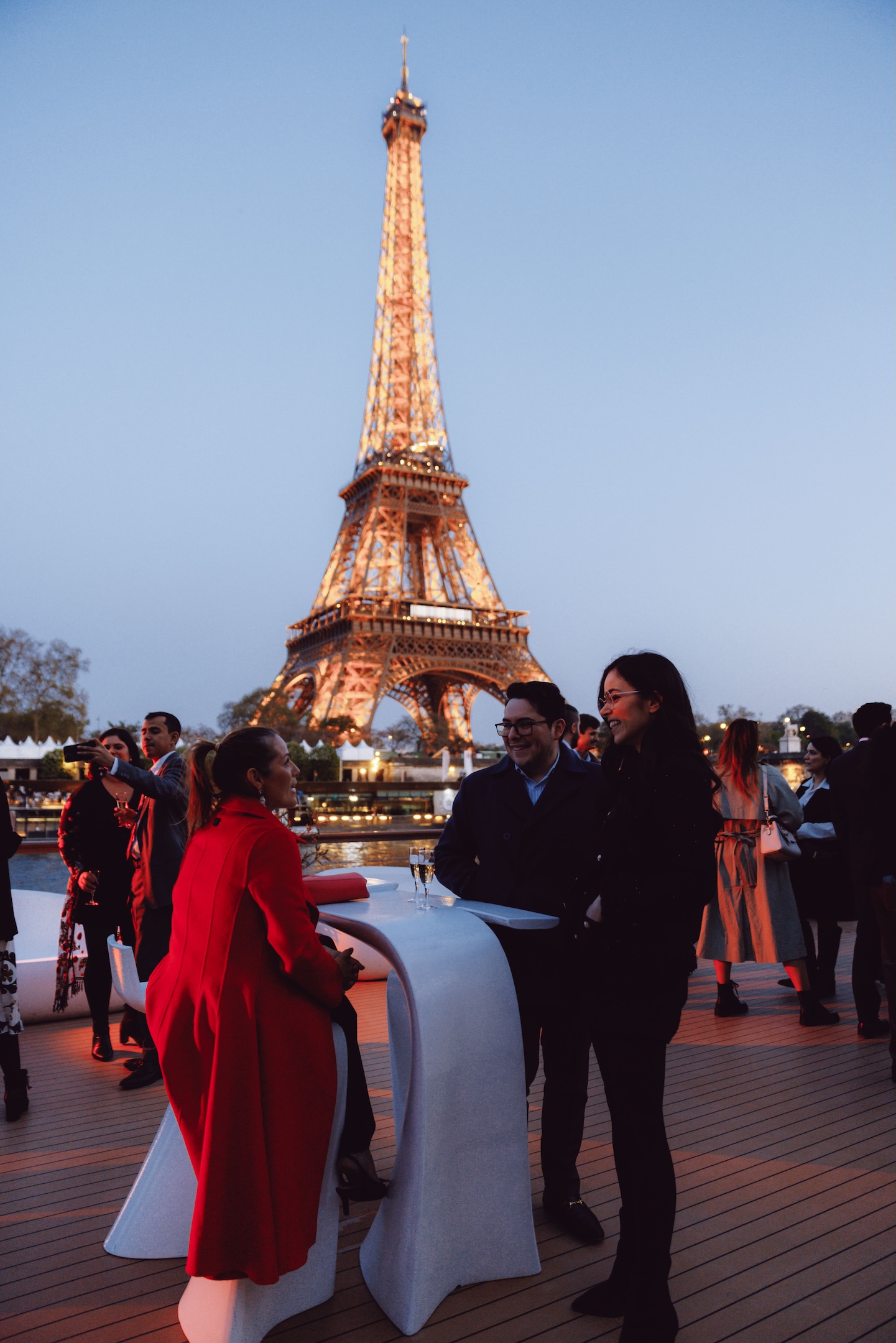 At 10:00 PM, the boat will leave the port for an unforgettable (1 hour) cruise on the Seine River. Around 11:00pm, the boat will return to Port de Debilly but the party will go on (until 2am)!