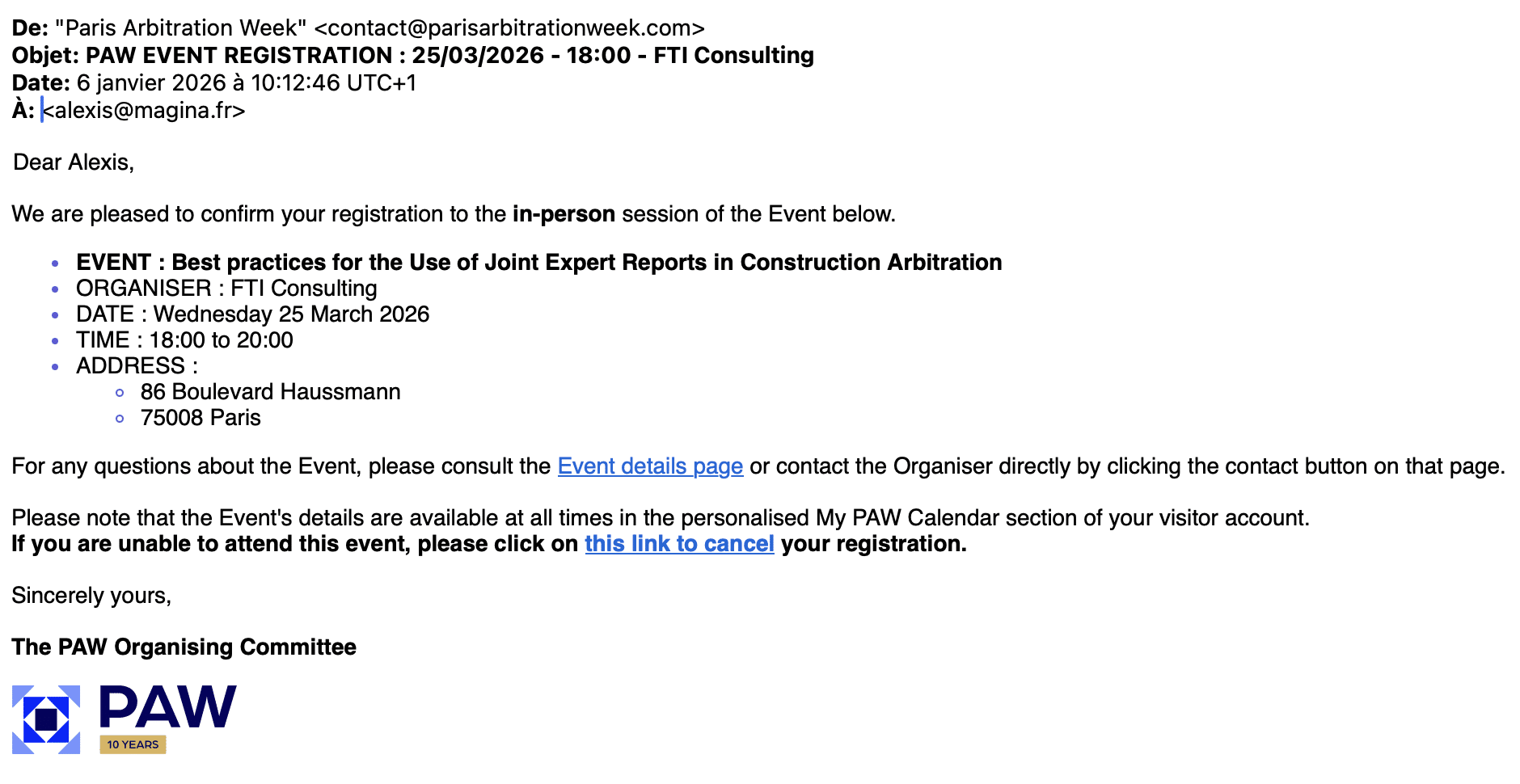 Participants who already have a PAW account will receive an automatic email notification requesting confirmation of their attendance. Upon confirmation, they will receive a registration confirmation.